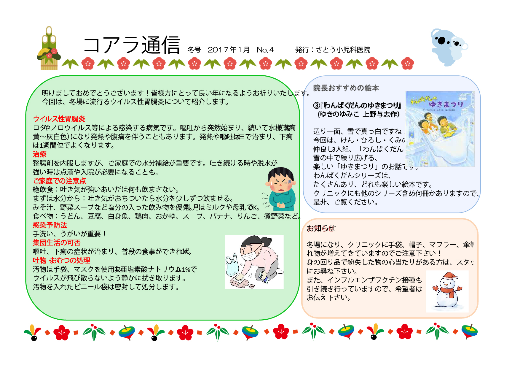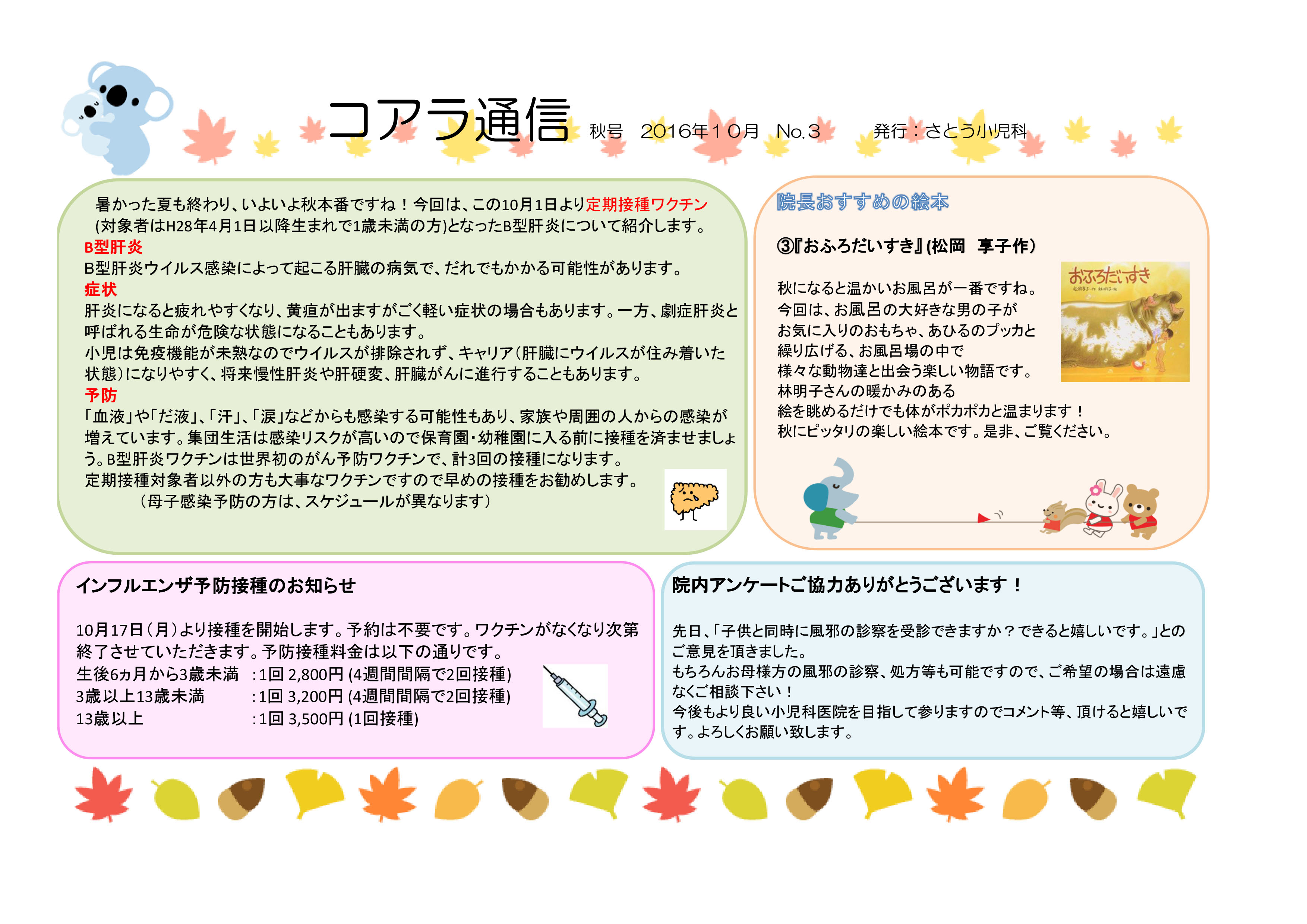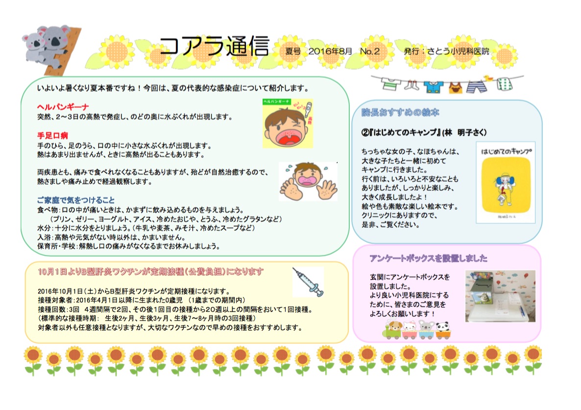 大切なワクチンなので早めの接種をおすすめします。 - ■2016.8.10 コアラ通信第2号発刊のお知らせ8月10日 クリニック通信(コアラ通信)第2号を発行しました!